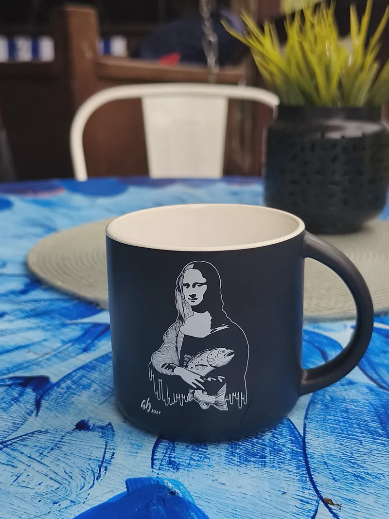 Rozbaw się każdego ranka z naszym czarnym, ceramicznym kubkiem „Mona Rybka”! Ten nietuzinkowy design przedstawia kultową Mona Lisę w zupełnie nowym, zaskakującym wydaniu – zamiast tajemniczego uśmiechu, dzierży w dłoni… rybę!
